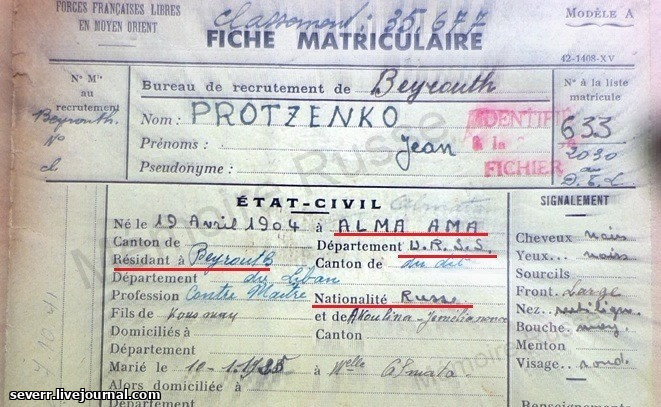 сын Кузьмы и Акулины Емельяновой, гражданство РОССИЯ, православный, профессия ПРОРАБ, с 10/01/1925 женат на девице Алмата (?) родившейся в г.Алеппо, 1 ребенок, проживает г.Бейрут, 07/10/1941 на период военных действий вступает в силы Свободной Франции генерала де Голля .