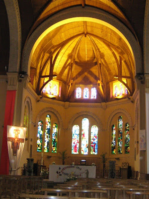особенно в субботу, потому что суббота базарный день, а церковь на рыночной площади.. пока у алтаря проходили какие то моления и заклинания, дети и попы чего то там торжественно проводили, в это время среди них и по залу бродили истинно верующие жители города, совмещающие приятное с полезным, т.е. рынок и церковь... все с кошелками, тележками, сумками, корзинками, крайне популярными у провинциальных французов для хождения за покупками и т.д. Чем дальше церемония приближалась к полудню, тем большее кол-во истинно верующих с кошелками прерывало церемонию своей назойливостью помолиться именно там, где идут торжества... чем напрочь испортили впечатление от действа... в процессе церемонии детишки подходили к черному как смоль падре из Конго, который им чего то шептал, после чего они омывали руки и крестились... частная католическая школа, долго подготавливаемая и репетируемая церемония... половина детей креститься не умеют... некоторые заканчивали на пупе, несколько человек, включая моего отпрыска, перекрестились по православному, что вызывало только одобрительное кивание попа (наш человек из социалистического Конго)...